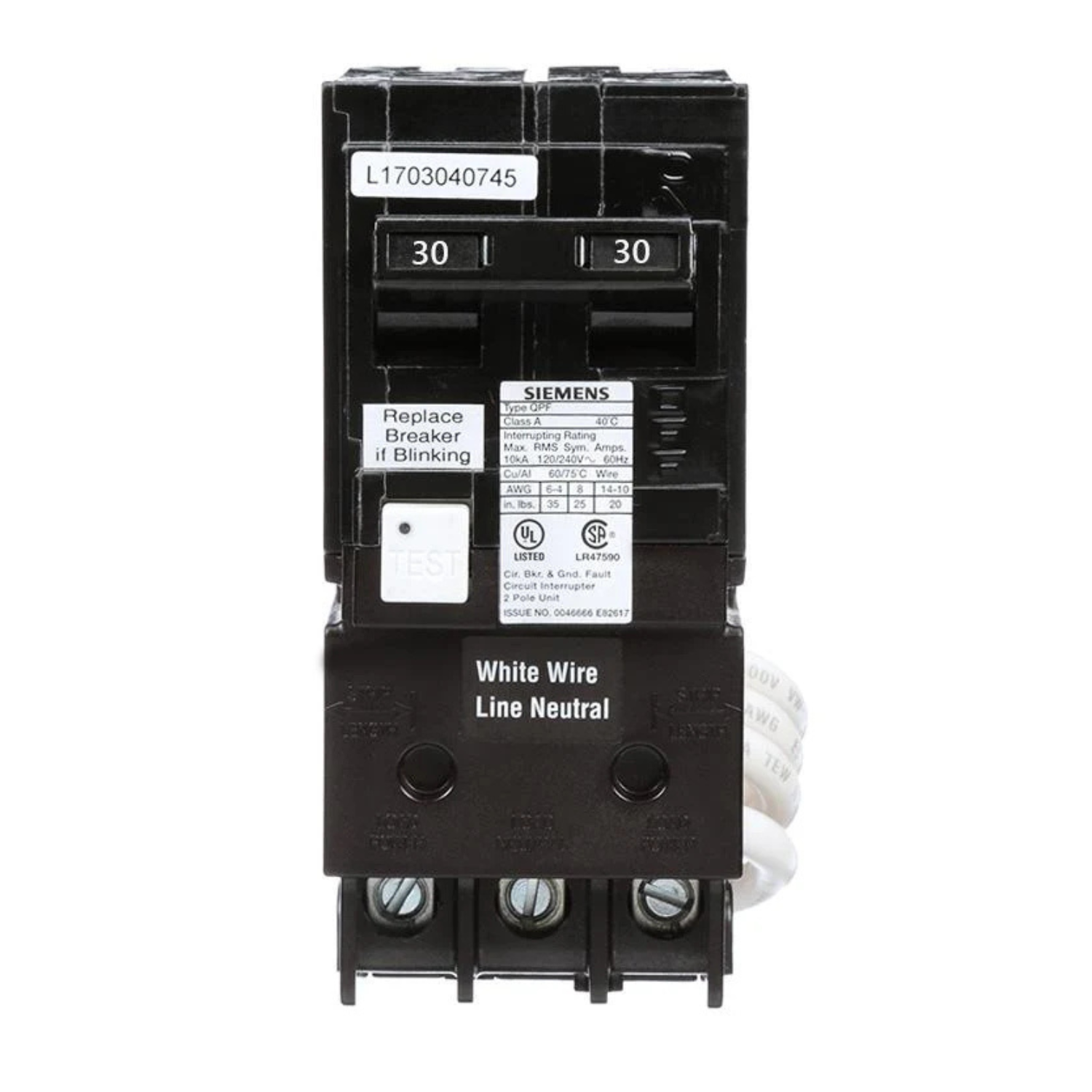 Este disyuntor bipolar con GFCI de 30 A de Siemens cuenta con una función de autoprueba. El disyuntor tiene licencia CSA y está homologado por UL para equipos tipo HACR (calefacción, aire acondicionado y refrigeración).